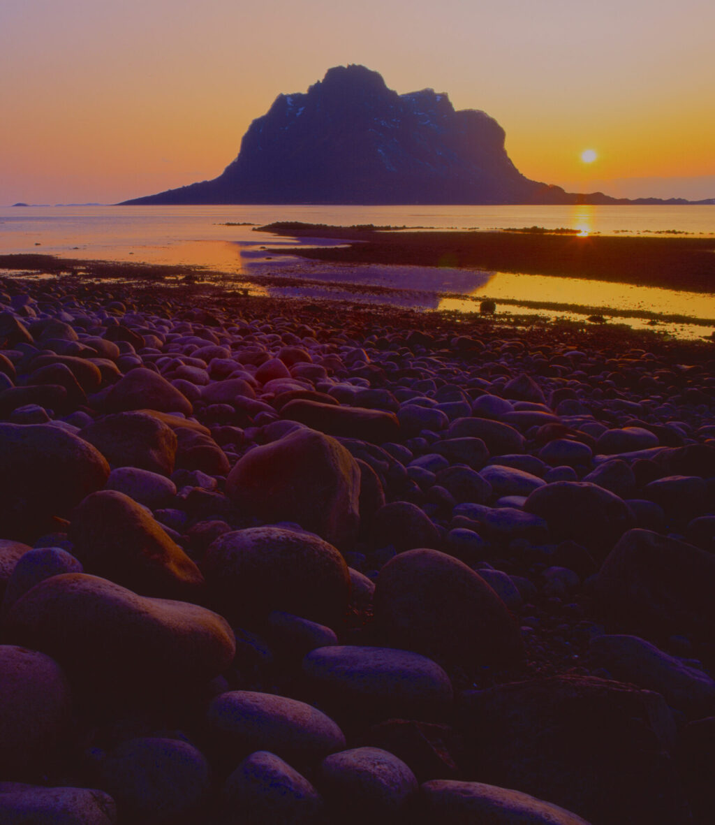 A_451_B. Vårkveld fra rullesteinsstranda på Sundsvoll, langs vestsiden av øya Vega i Helgeland. Sett mot den trolske klippeøya Søla hvor det en gang var en flokk med villgeiter. Vega kommune i Nordland.
