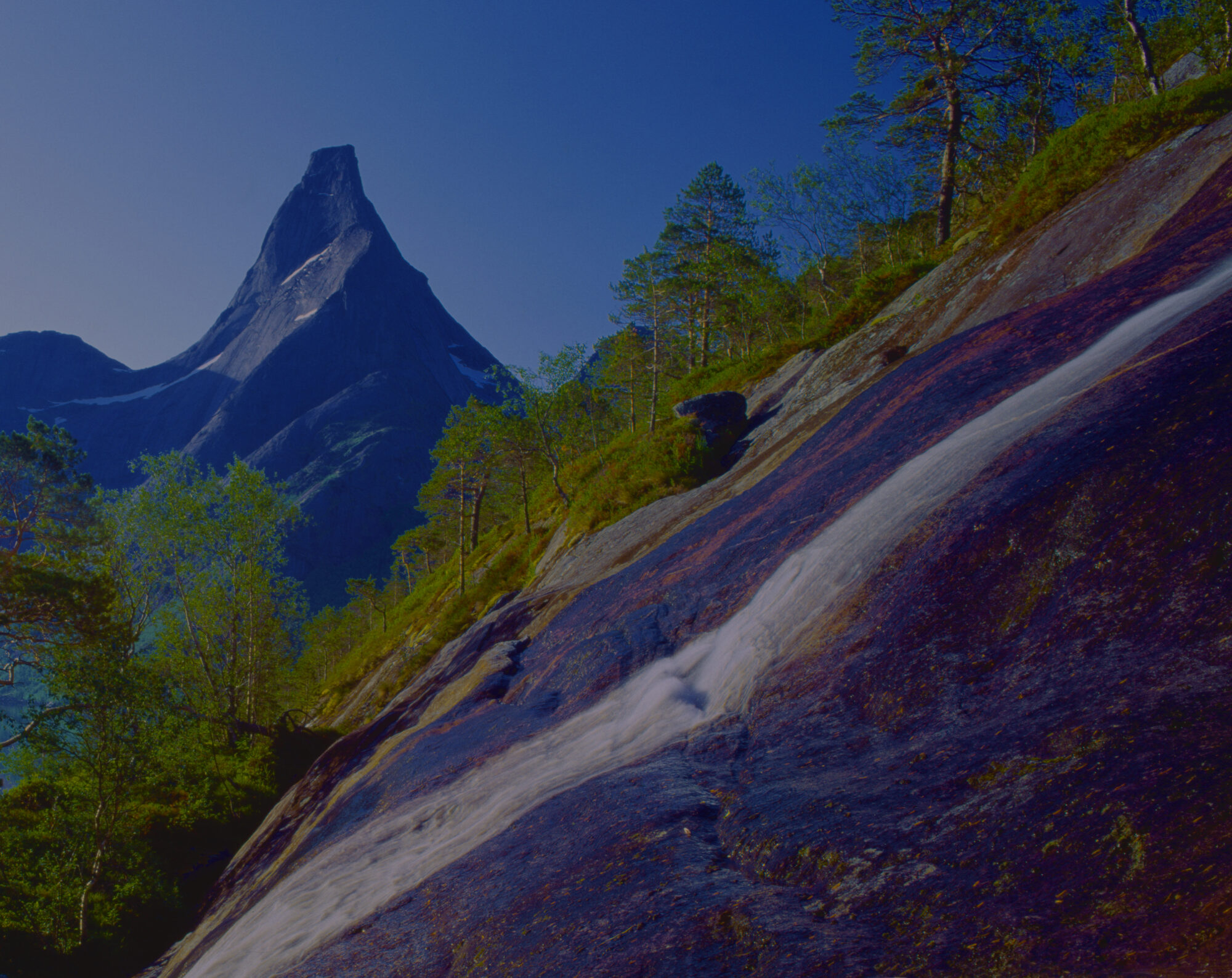 A_510. Norges nasjonalfjell, "En ambolt hvorpå Gudene kunne hamre". Sitat fra Petter Wessel Zappfes bok "Barske glæder". En bekk styrter nedover et sva mens Stetind rager i nordøst. Sett ovenfor Stefjorden i Tysfjord.