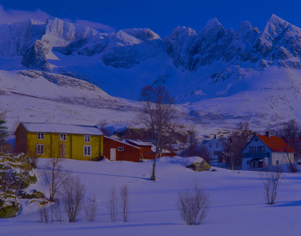 5093. Nordlandsnatt. Et fargespill av de sjeldne, sett fra Mjelde nord for Bodø mot Lofotveggen. Lyset fra midnattsolen prøver å trenge gjennom de blå skyene.