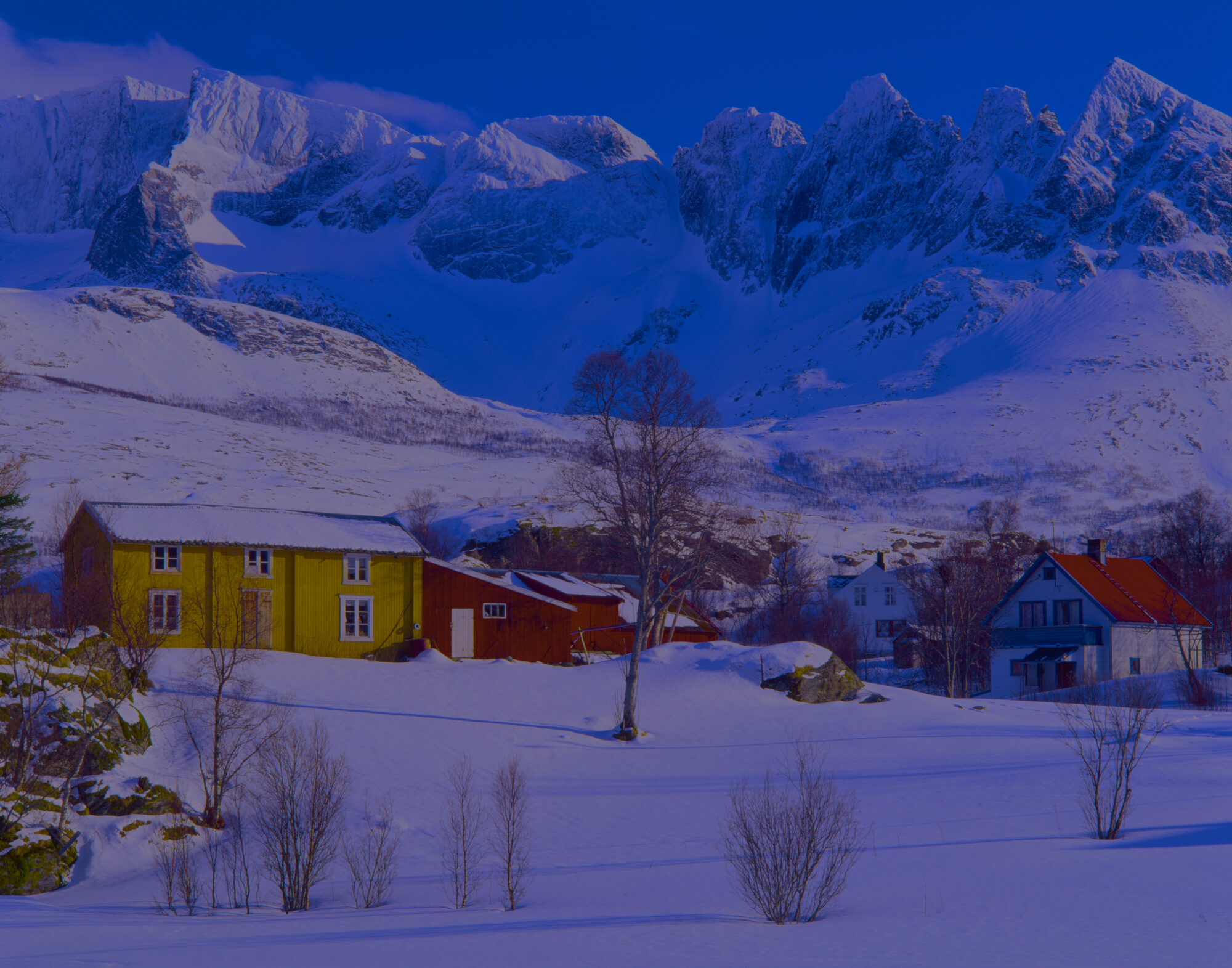 D_324. Det pittoreske Aldersundet er en av høydepunktene langs rv. 17 i Helgeland. Sett en vinteraften mot øya Aldra med Hjarttinden. Lenger bak troner Okstind og Liatind.