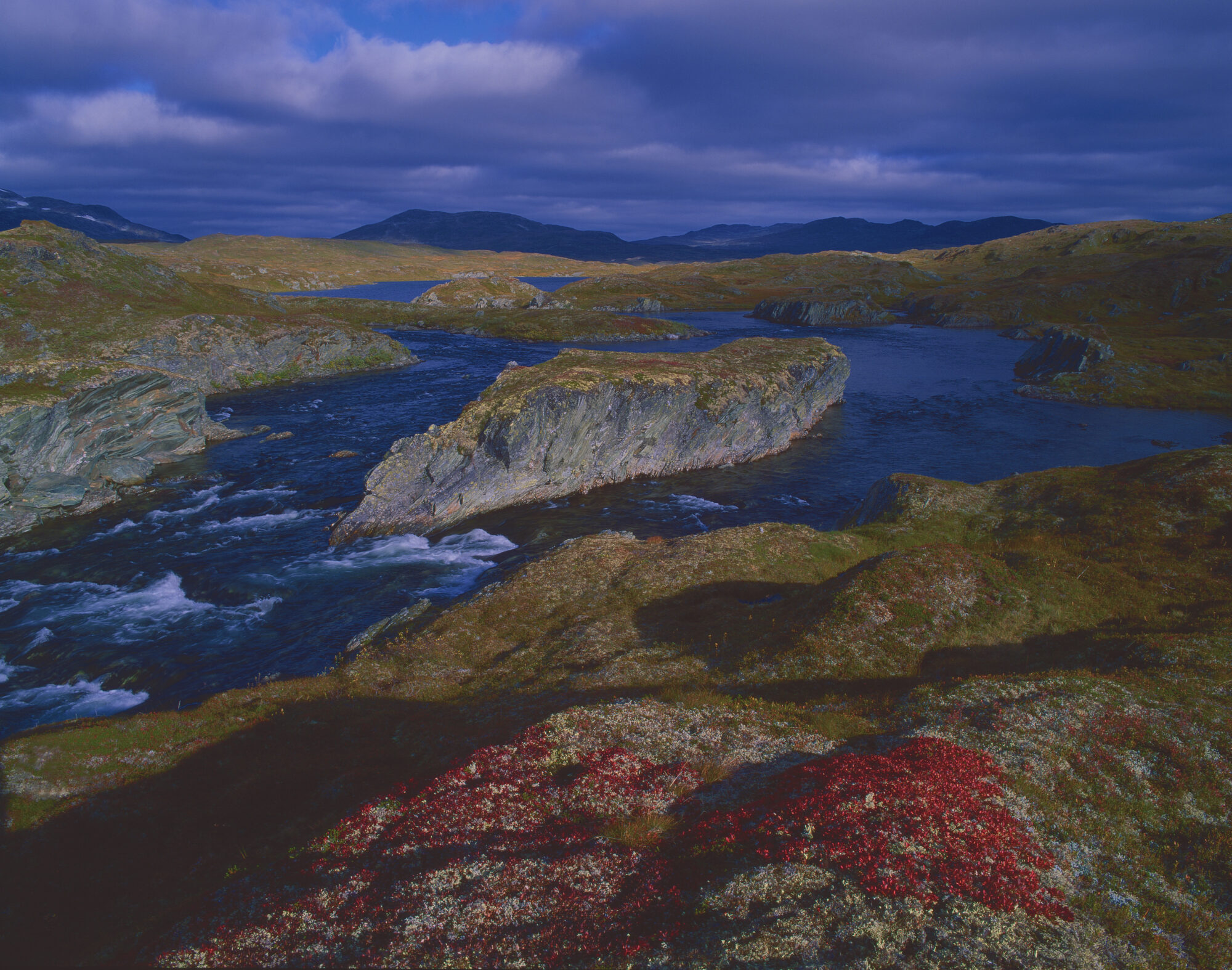 F_270. Høstmorgen i Børgefjell. Parti av Kjukkelelva i Børgefjell nasjonalpark, sett mot Lille Kjukkelvatn og Lille Kjukkelfjell i nord. Ildrødt rypebærlyng i front. Hattfjelldal kommune i Nordland.